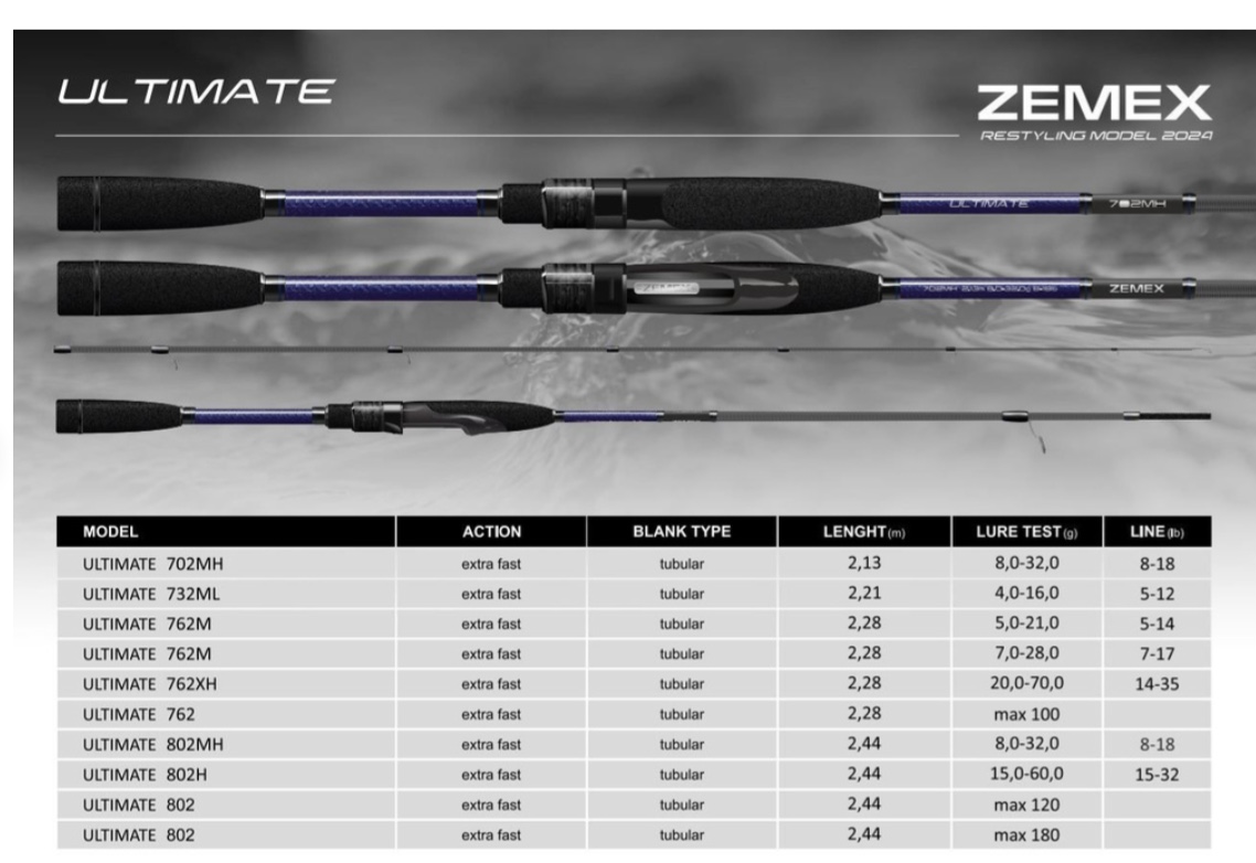 Обновленный модельный ряд включает в себя удилища с широким тестовым диапазоном, что поможет подобрать оптимальный вариант под самые разные условия ловли, техники анимации, и приманки. В линейке присутствуют модели от довольно легких, например, 732ML тестом 4-16, которая придется по душе любителем деликатной ловли на легкий джиг, до мощных удилищ с тестом 180 грамм, позволяющим использовать популярные сегодня «бигбейты». Концепция, размерный ряд и расстановка колец в ZEMEX ULTIMATE, были адаптированы под реальные условия европейской рыбалки в пресной воде. Мы увеличили размеры running и top колец. Теперь ловля при низких температурах стала комфортней. ZEMEX ULTIMATE, позволяет сделать качественную анимацию приманки, почувствовать деликатную поклевку осторожной рыбы, просечь твердую пасть судака, быстро и уверенно поднять трофей с большой глубины.