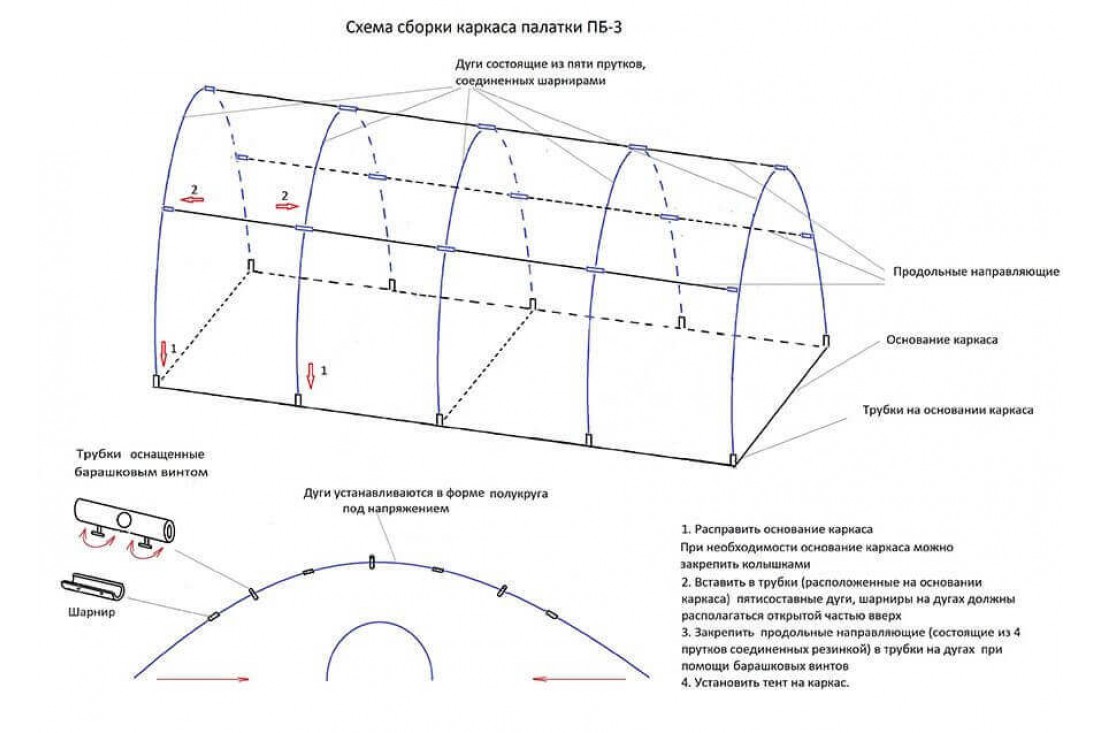 - В трубки, расположенные в основании каркаса, вставьте складные дуги. Шарниры на дугах устанавливаются открытой частью вверх;