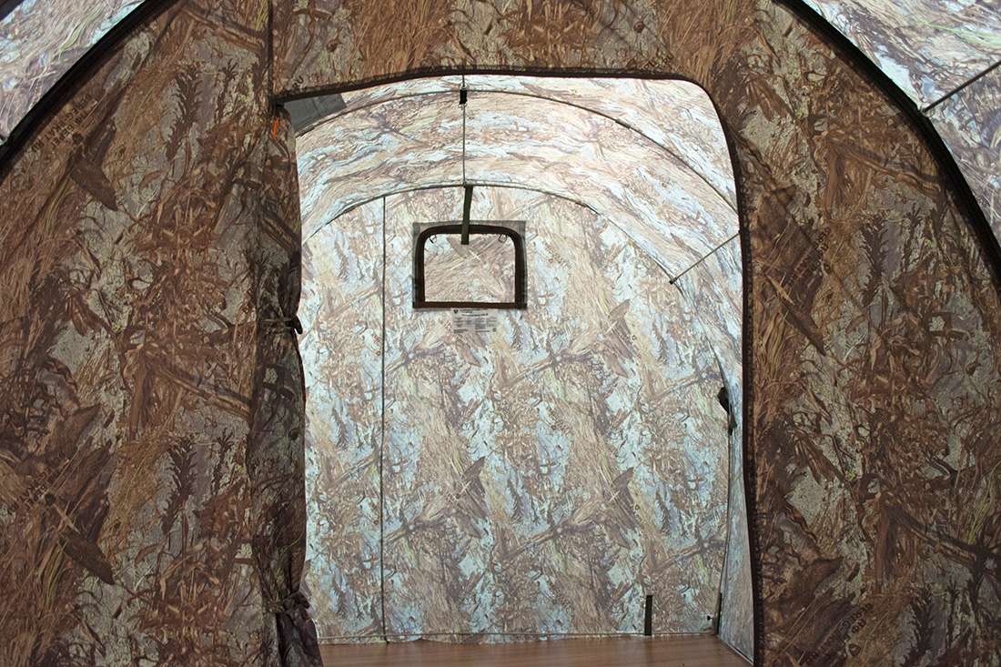 - Складной распашной дверью.Съемная дверь, делает возможным вход и выход без использований молний, что помогает сохранить тепло в палатке;