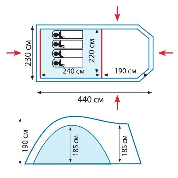 - Двухслойная кемпинговая палатка с четырьмя входами, большим фойе - Входы спального отделения продублированы москитной сеткой