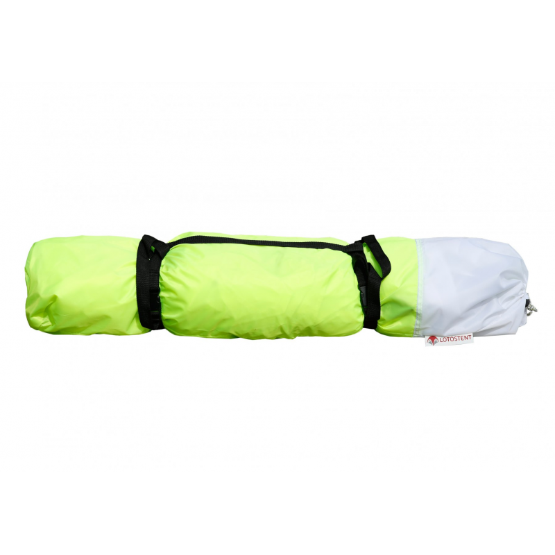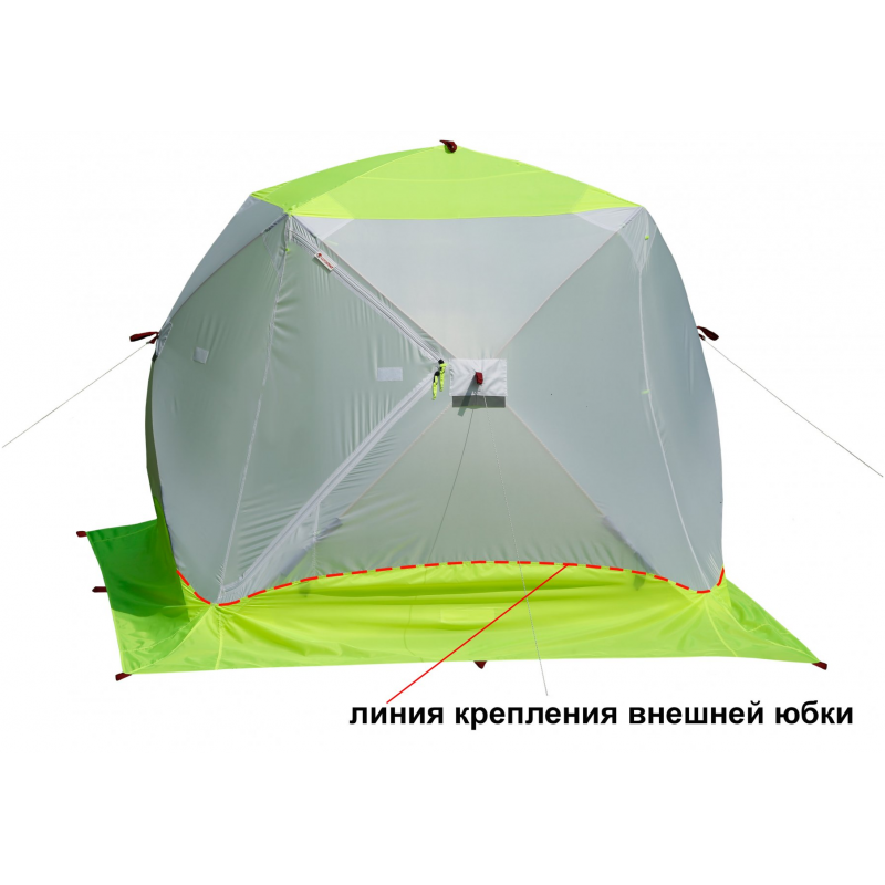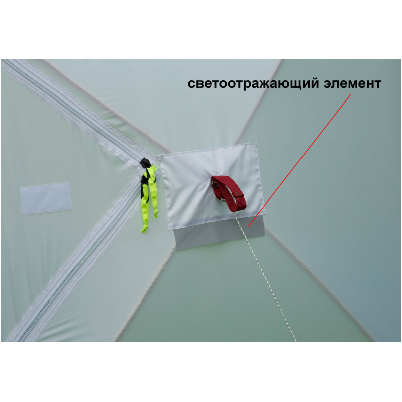 - Влагозащитный тент (приобретается отдельно). Для защиты зимней палатки от внешних осадков предусмотрен влагозащитный тент (опция), который крепится к куполу палатки и дублирует все ее функциональные элементы.