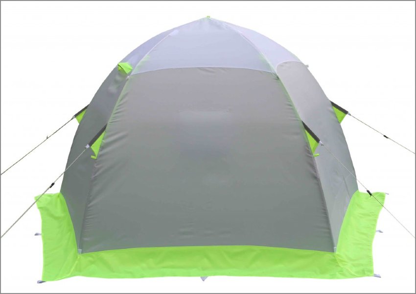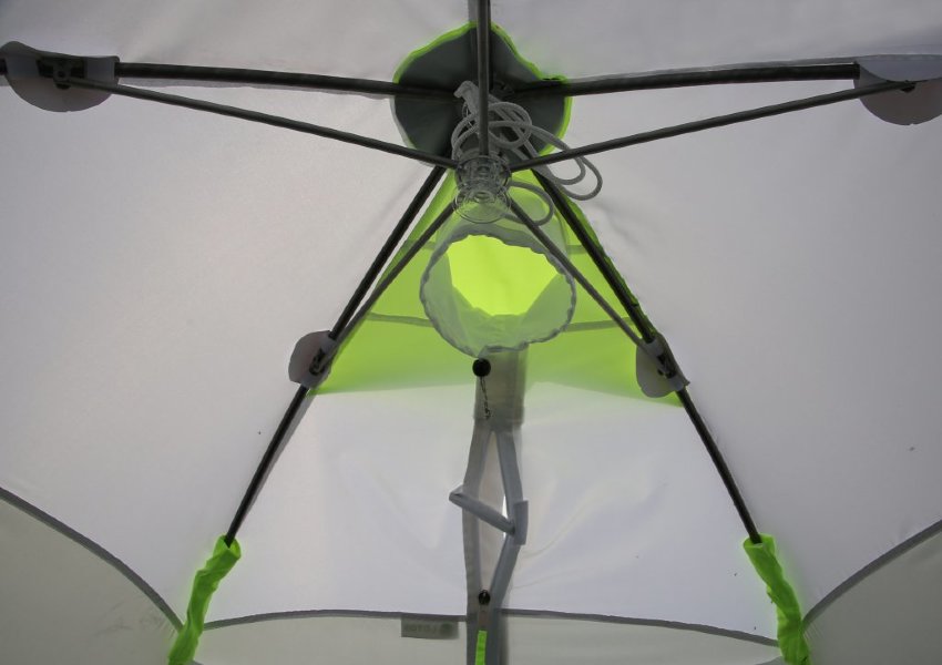 Палатка предназначена для использования в зимнее время года и способна выдерживать температурные показатели до -50 градусов благодаря некоторым конструктивным особенностям: