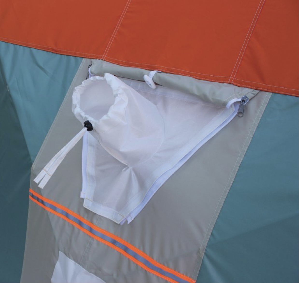 -Оригинальный дизайн наружного тента. Оранжевый верх купола палатки издалека виден днем и хорошо заметен ночью (при горящем фонаре)