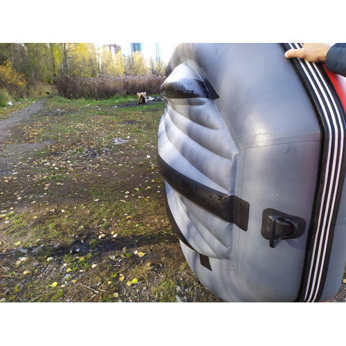 Для максимальной защиты лодки от механических повреждений, баллоны дополнительно проклеены привальным брусом с брызгоотбойником (броня) в 2 ряда. По всей центральной части и боковым частям низа дна, а также на концах баллонов дополнительно наклеен донный брус.