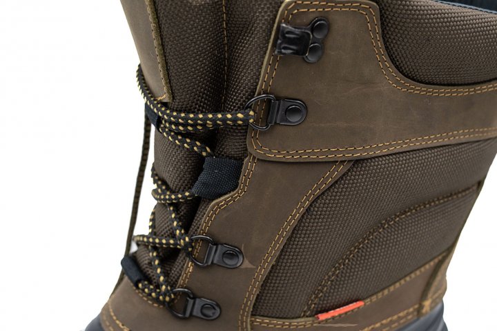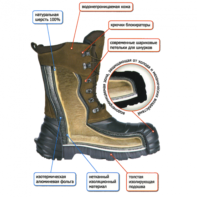 Дополнительные преимущества этого материала легкий вес; использование ткань что дышит; легкое содержание в чистоте - материал быстро высыхает.Нижняя часть сапог изготовлена из специального, супер легкого, термоизоляционного материала - полимера EVA, что обеспечивает защиту ног от замерзания. Есть съемный валенок из натуральной овечьей шерсти. Сапоги на шнурках, есть крючки блокираторы и современные шариковые петли для шнурков.
