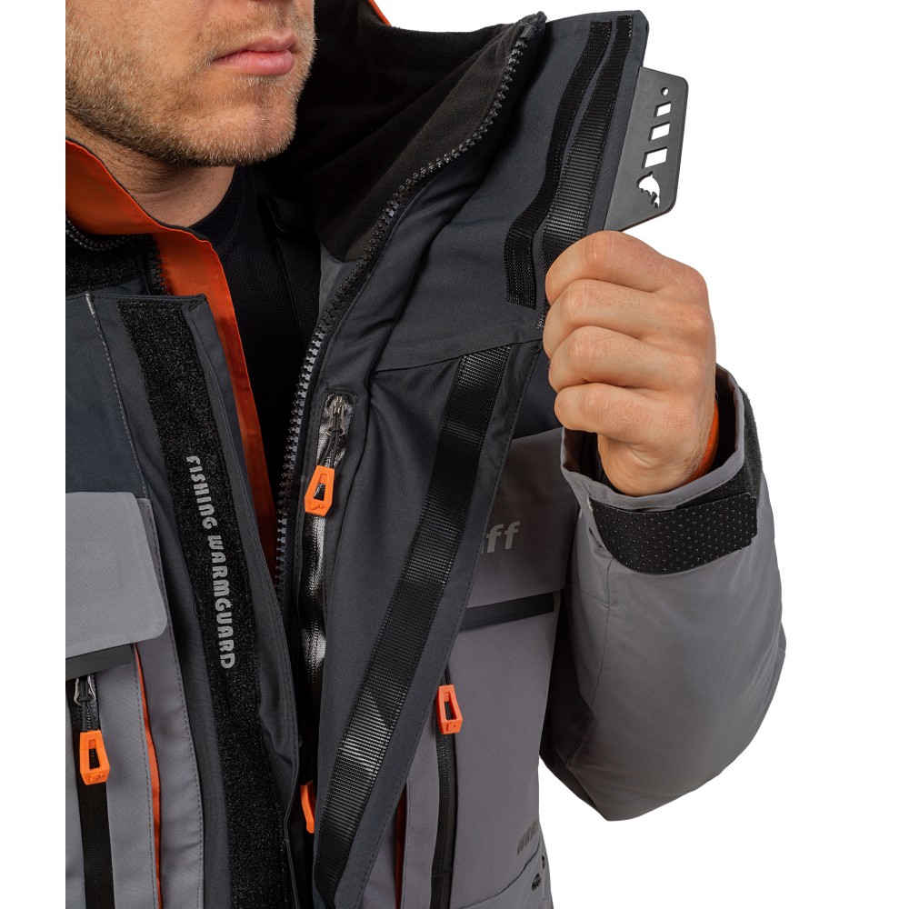Костюм имеет новый стильный дизайн в черно-сером цветовом решении, с ненавящевым добавлением оранжевых фрагментов. Так же на костюме имеется светоотражающие элементы для повышения заметности на рыбалке в целях безопасности.